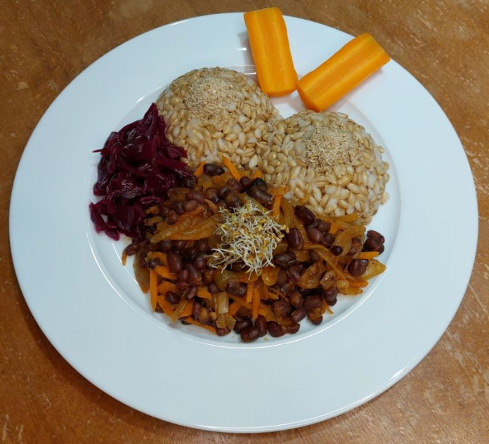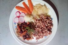 - Tuto směs podáváme s jakoukoliv obilovinou, na fotce je pohanka vařená se slunečnicovým semínkem a zeleninovým salátem s červené řepy.
