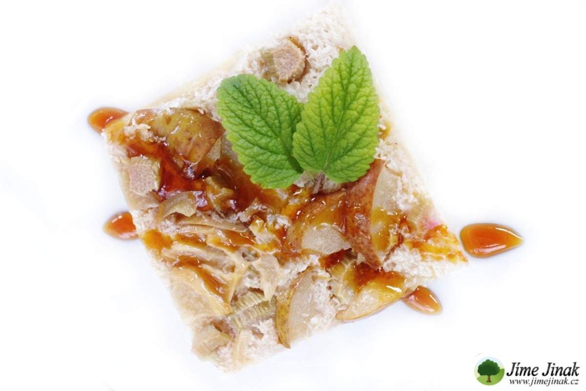 - Když už korpus drží tvar a není tekutý, vyndáme plech z trouby, posypeme rovnoměrně rebarborou a hruškou, zasypeme sladem (polijeme, pokud nemáme sypký) a dáme dopéct.