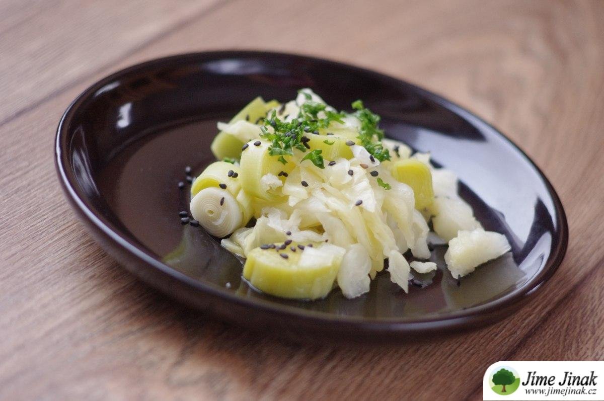 - Omyjeme a nakrájíme zeleninu – kapustu na proužky, pórek na kolečka.