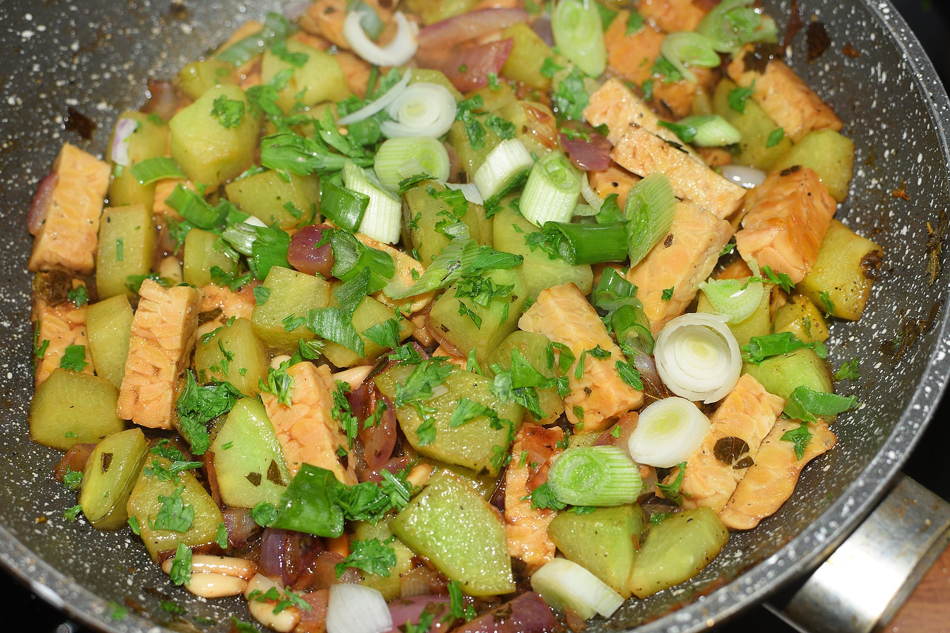 - V pánvi rozehřejte olej, přidejte piniové oříšky, čajot, kmín, listy kari a cibuli. Opečte. Vařte na mírném ohni. Přidejte tempeh a znovu jemně opečte.