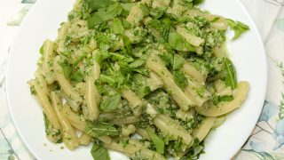 - Uvařte těstoviny, přidejte je na pánev, opepřete a promíchejte a chvíli společně povařte na vysokém plameni. Posypejte lístečky rukoly.