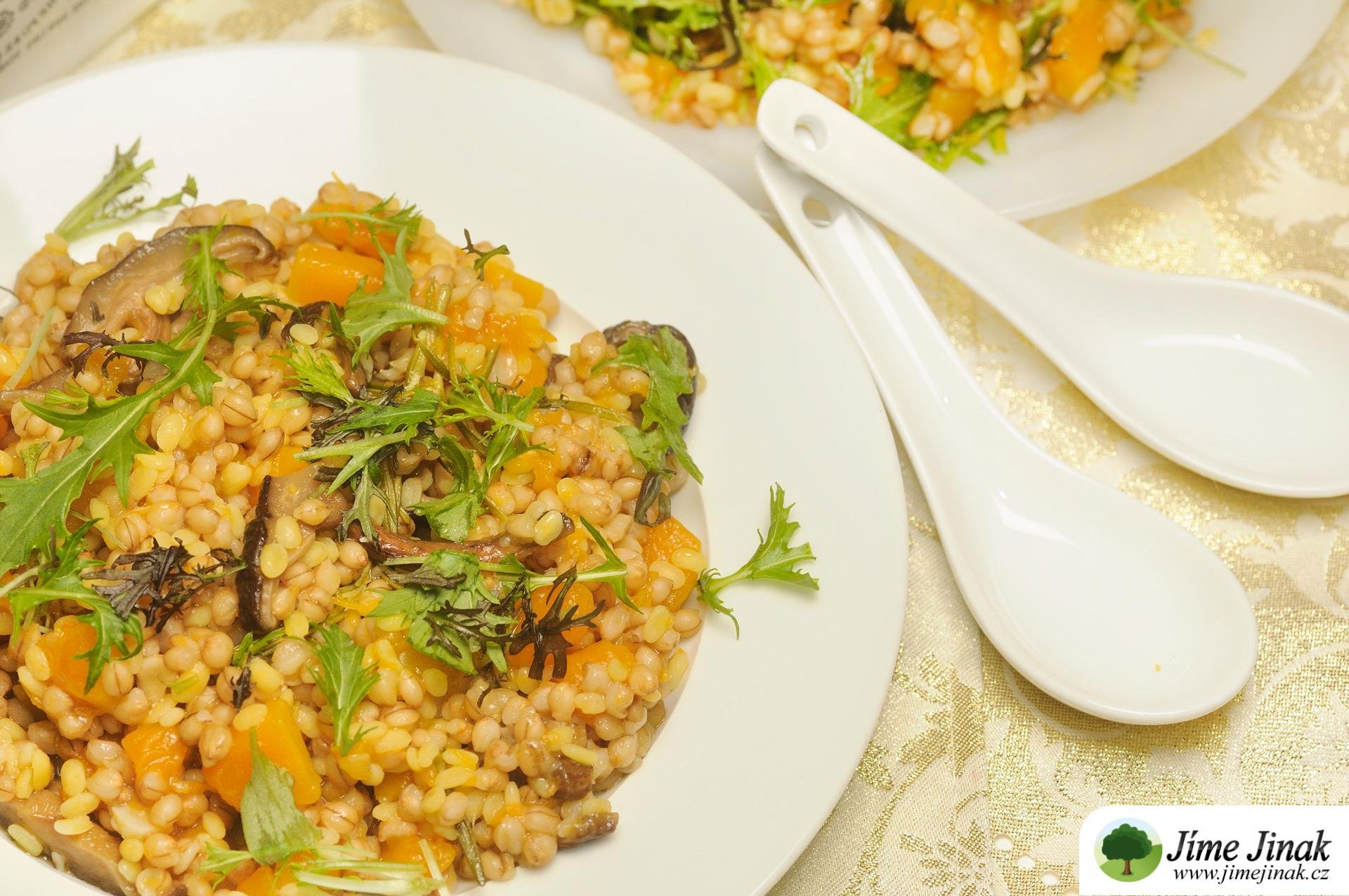 - Přidejte do pánve s dýní adzuki a ječmen, promíchejte a vařte dalších pár minut.