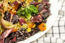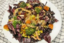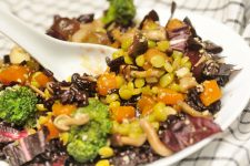 - Uvařenou rýži podávejte ochucenou olivovým olejem a solí, přidejte vše ostatní a posypejte konopnými semínky a červenou čekankou.