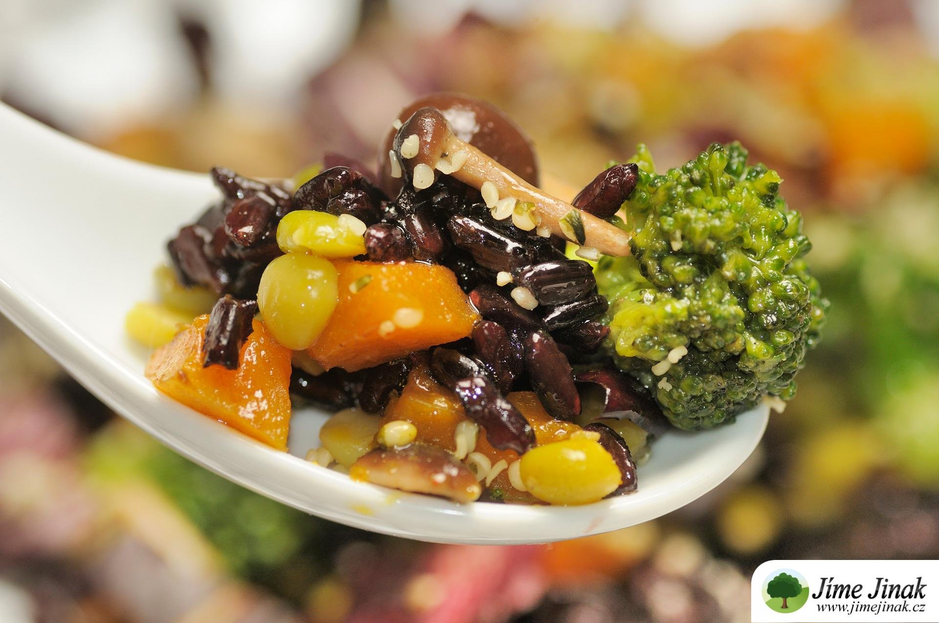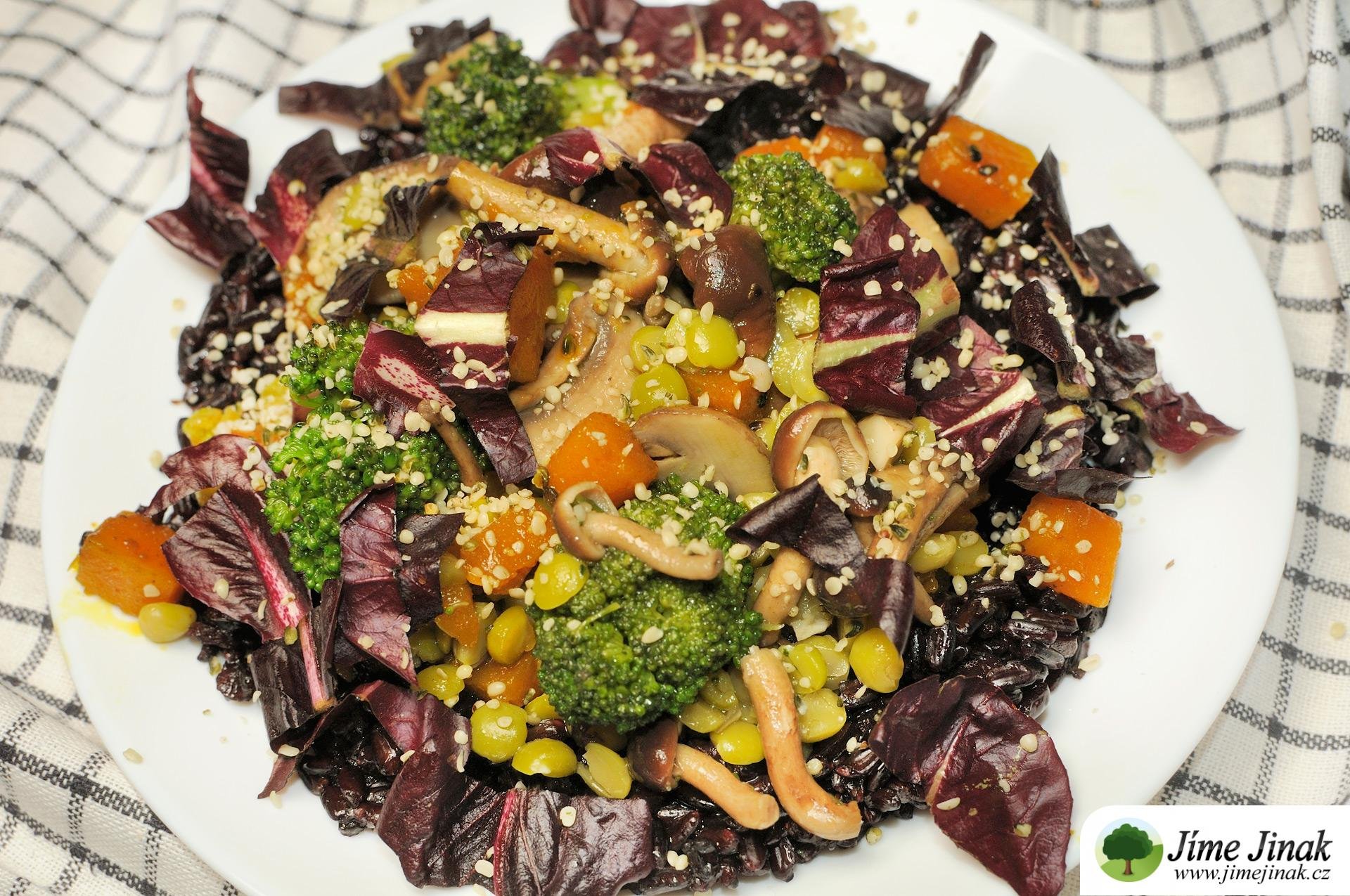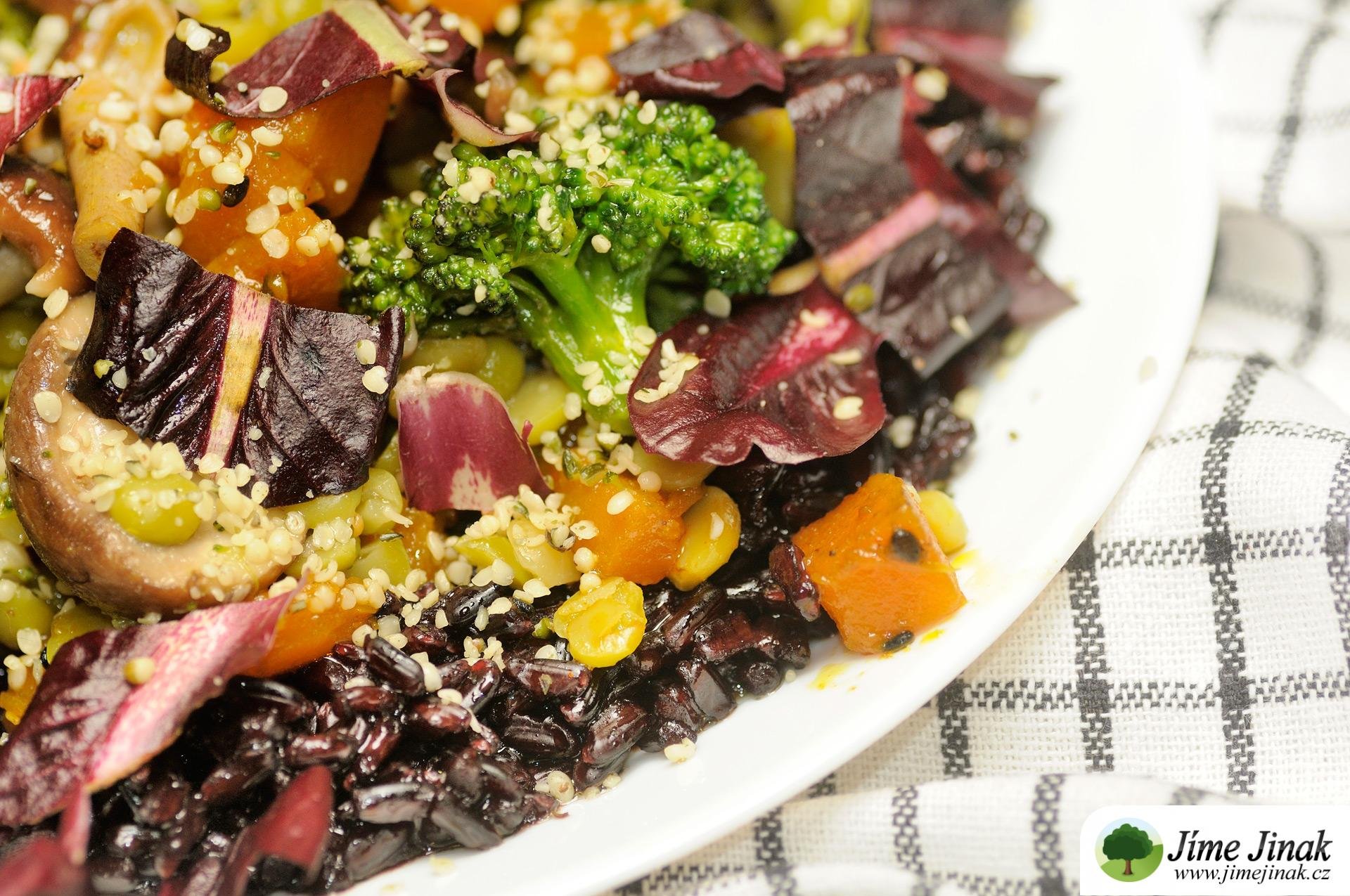 - Uvařenou rýži podávejte ochucenou olivovým olejem a solí, přidejte vše ostatní a posypejte konopnými semínky a červenou čekankou.