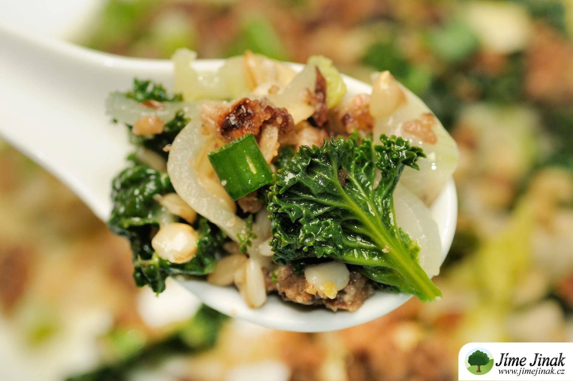 - Na pánev dejte olej, dýni na malé kousky, sezamová semínka, semínka černuchy, papriku, chilli papričku, kurkumu, sůl a osmahněte. Podlijte trochou vody a ochuťte umeoctem. Duste, dokud dýně nezměkne.