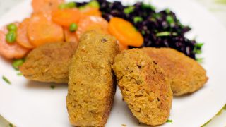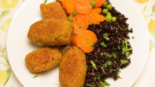 - Na fotografii s černou rýží, rukolou a dušenou mrkví.