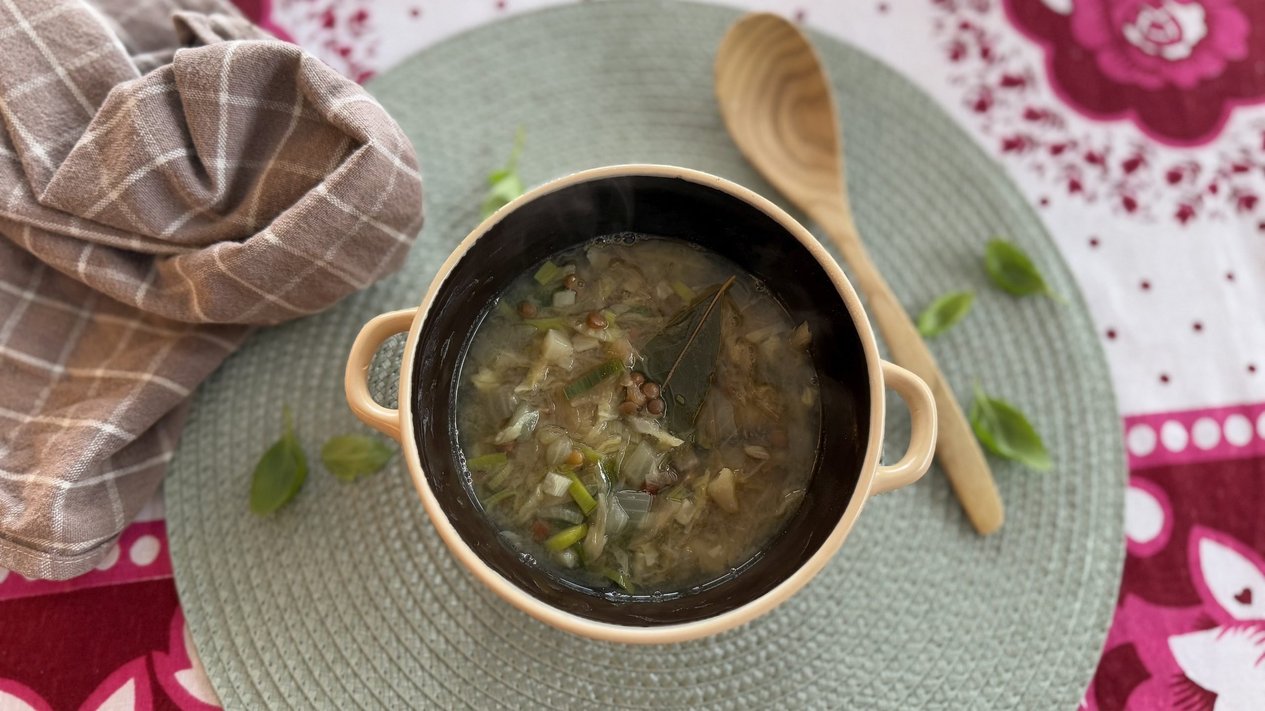 - V naší polévce je použíta neloupaná červená čočka, která skvěle drží tvar i po uvaření. Do polévky jsem jí dala i s řasou hijiky, se kterou byla uvařená, proto vidíte v polévce malé černé kousky, to je řasa.