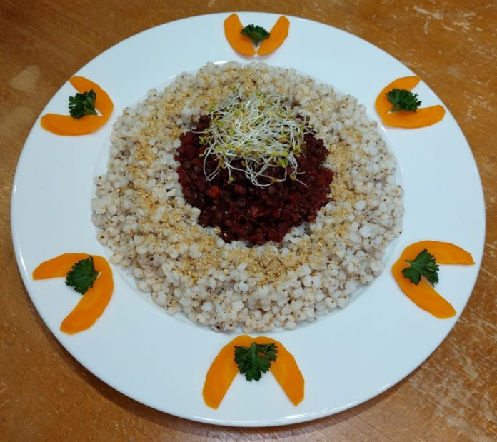 - Vločky rozmixujeme ponorným mixérem na kaši, přidáme protlačený česnek, sůl, nastrouhanou cuketu, nakrájenou cibuli a semínka slunečnice.