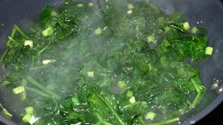 - Na pánev dejte trochu oleje a přidejte nasekaný česnek a špenátové listy. Lehce osmahněte a podlijte trochou vody.