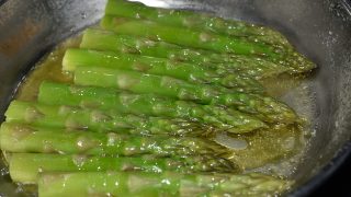 - Mezitím si očistěte chřest. Odlomte tvrdý konec, dejte na pánev s trochou vody, osolte a duste. Ke konci pokapejte olejem a dovařte. Posypejte petrželkou.