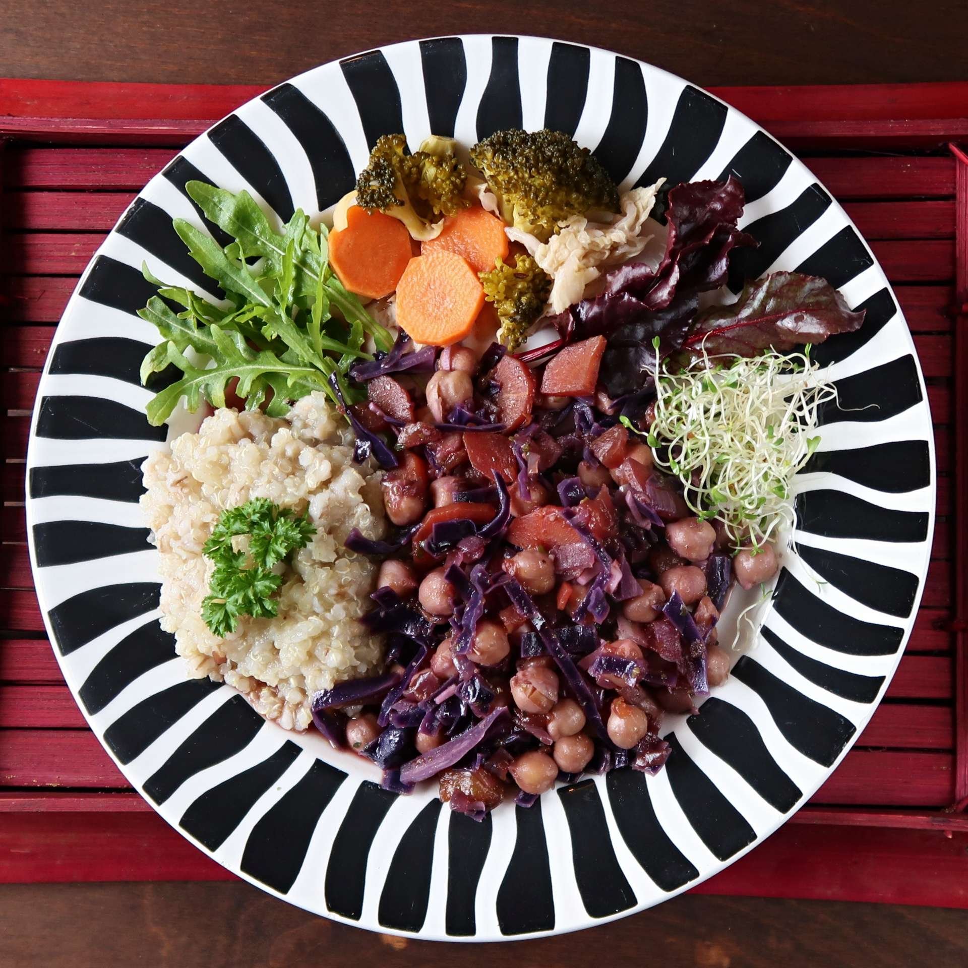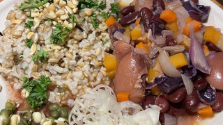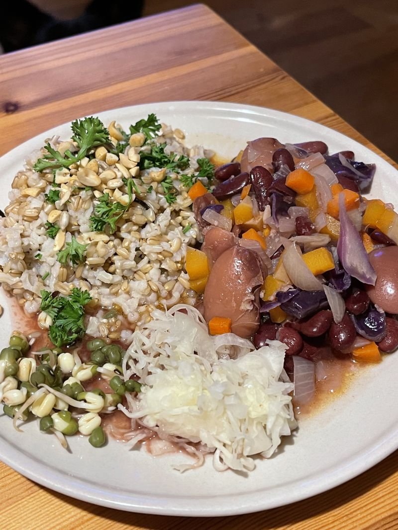 • Toto jídlo je kompletní talíř. Je zde jak luštěnina (fazole), tak obilovina (příloha -rýže) a tepelně upravená zelenina (v guláši). Jídlo skvěle doplní kvašený mrkvovo brokolicový salát. Ještě je důležité doplnit talíř o zelené natě – ideálně posypat petrželkou a praženými slunečnicovými, nebo sezamovými semínky.