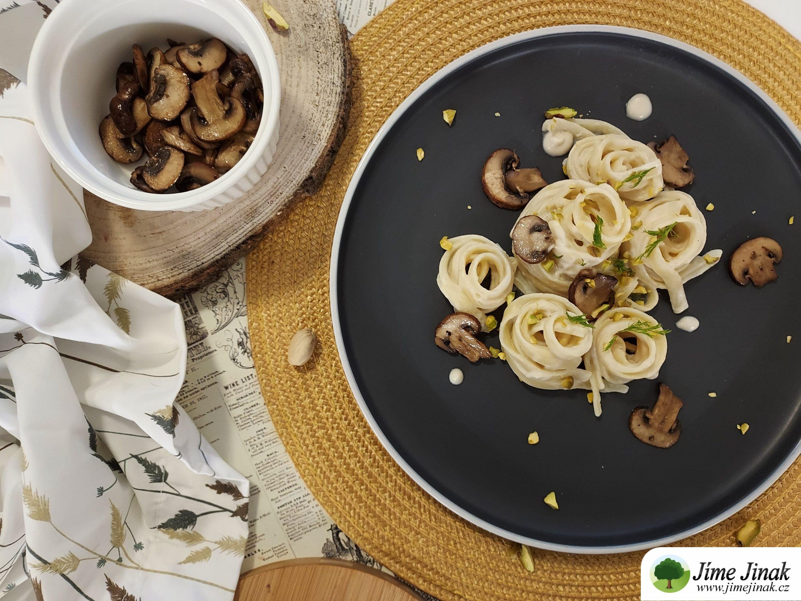 - Těstoviny podáváme spolu s žampiony, posypané pistáciemi a natí z fenyklu.