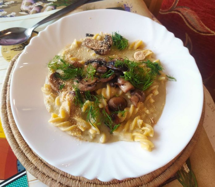 - Obsah hrnce nalijeme do mixéru, přidáme kešu ořechy, špetku fenyklu a mixujeme do hladka. Omáčku dáme do hluboké pánve, přidáme těstoviny, promícháme a dle potřeby naředíme vodou z vaření těstovin. Krátce společně promícháme tak, aby se těstoviny omáčkou obalily.