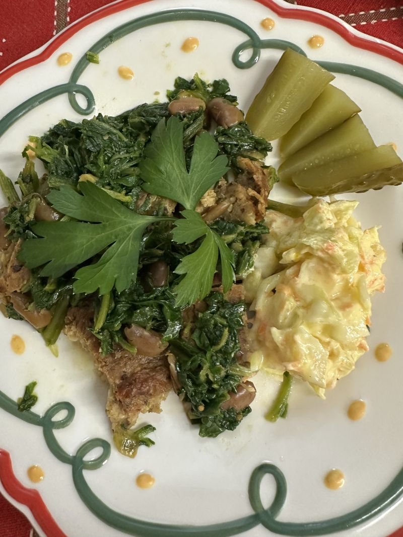 - Když je knedlík lehce opečený, přidáme fazole, mangold a krátce prohřejeme.