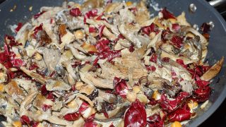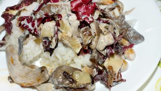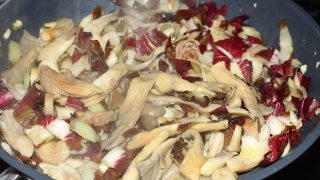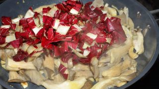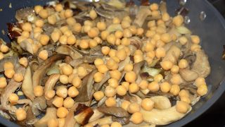 - Když je hlíva měkká, přidejte nasekanou spodní část čekanky, osolte, opepřete a znovu orestujte. Přidejte cizrnu, sójovou smetanu, promíchejte, a chvíli povařte.