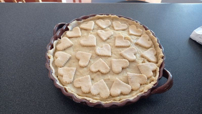 - Z 2/3 těsta vyválíme tenký plát, dáme do formy, kraje zařízneme a dno propícháme vidličkou. Na dno poklademe jablka, zalijeme omáčkou. Zbylé těsto vyválíme, nakrájíme na proužky a ozdobíme jimi vrch koláče.