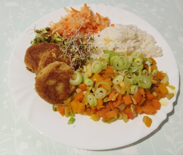 • Kdo potřebuje připravit kompletní talíř například na večeři, protože v práci nemá dobrý oběd, doplní ještě bílkoviny v podobě luštěnin. Můžeme na talíř dát porci čočky, fazolí, hrachu atd. nebo je můžeme vmíchat k zelenině a houbám do woku. Nemáme-li nic namočeného nebo uvařeného, sáhneme po tofu či tempehu.