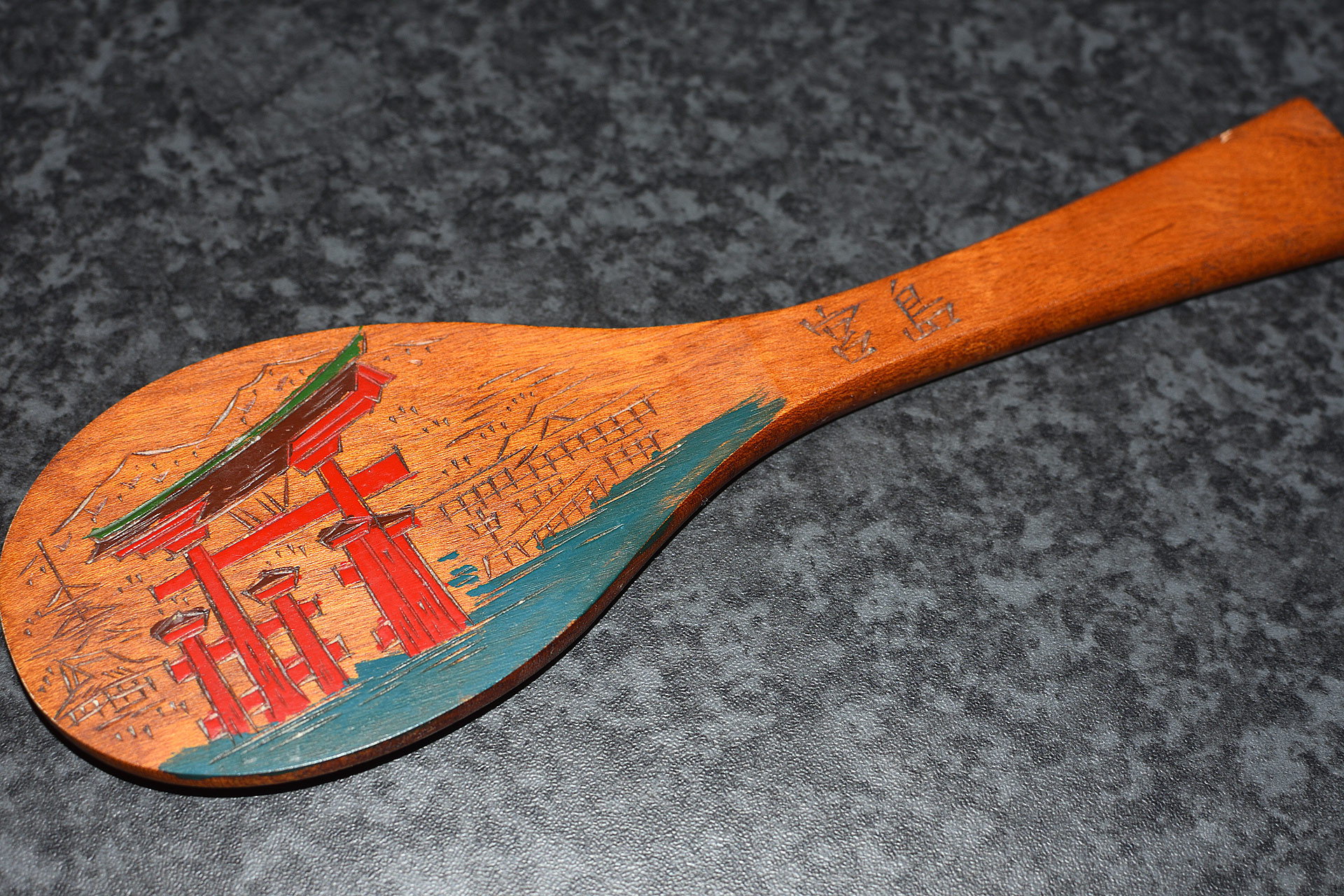 Shamoji je plochá lopatka, často dřevěná nebo plastová, určená k podávání rýže, aniž by se zrnka rozmačkala nebo rozbila. Je to jeden z těch obyčejných předmětů, které dělají rozdíl: rýže zůstává nadýchaná a neporušená. Byla mi darována, starám se o ní jak o nějakou vzácnost.