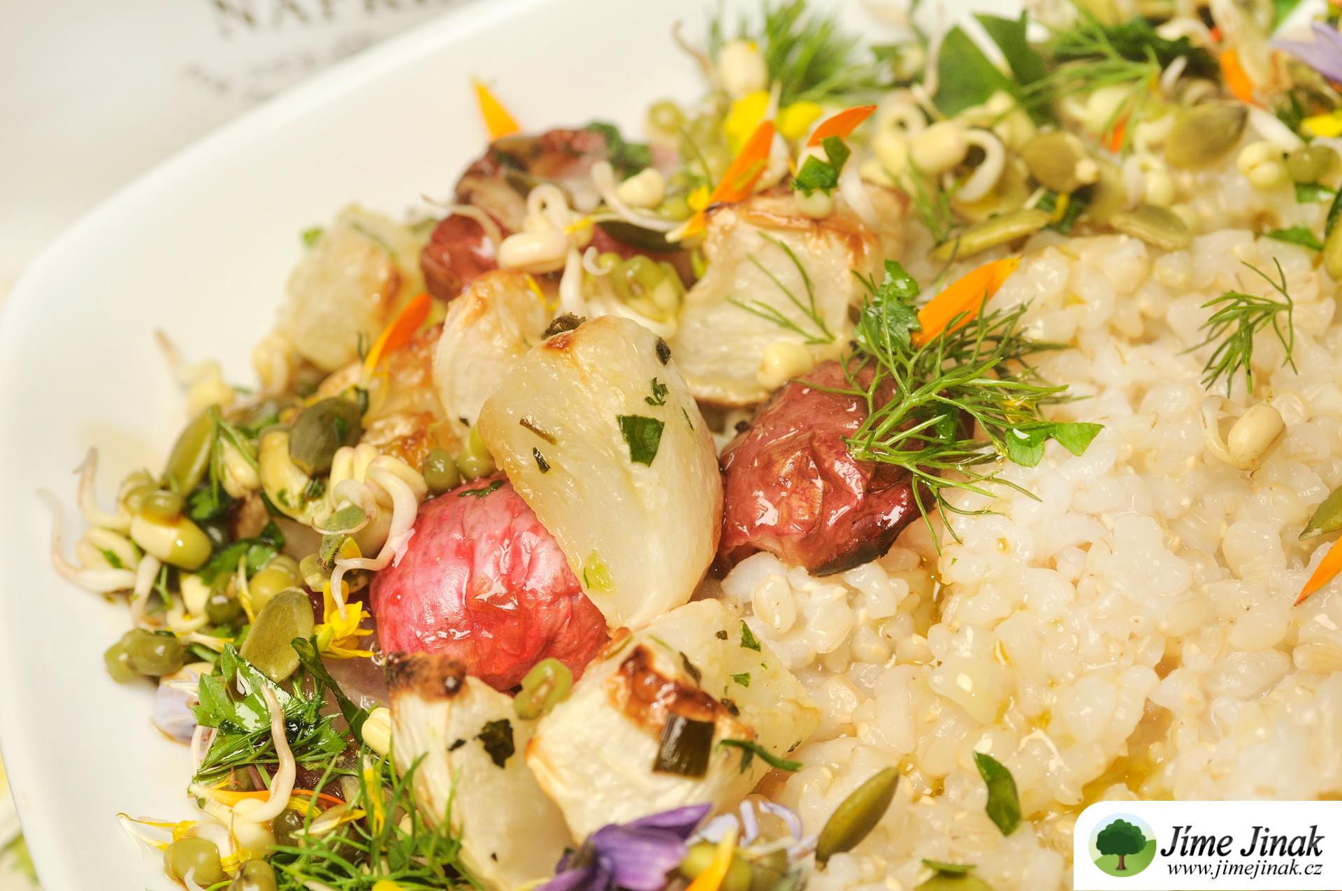 - Jakmile je rýže uvařená, naservírujte ji na talíř, přidejte pečenou zeleninu, vše dochuťte fialkovým octem, tamari, několika kapkami extra panenského olivového oleje, dýňovými semínky, květinami, klíčky mungo a čerstvou petrželkou.