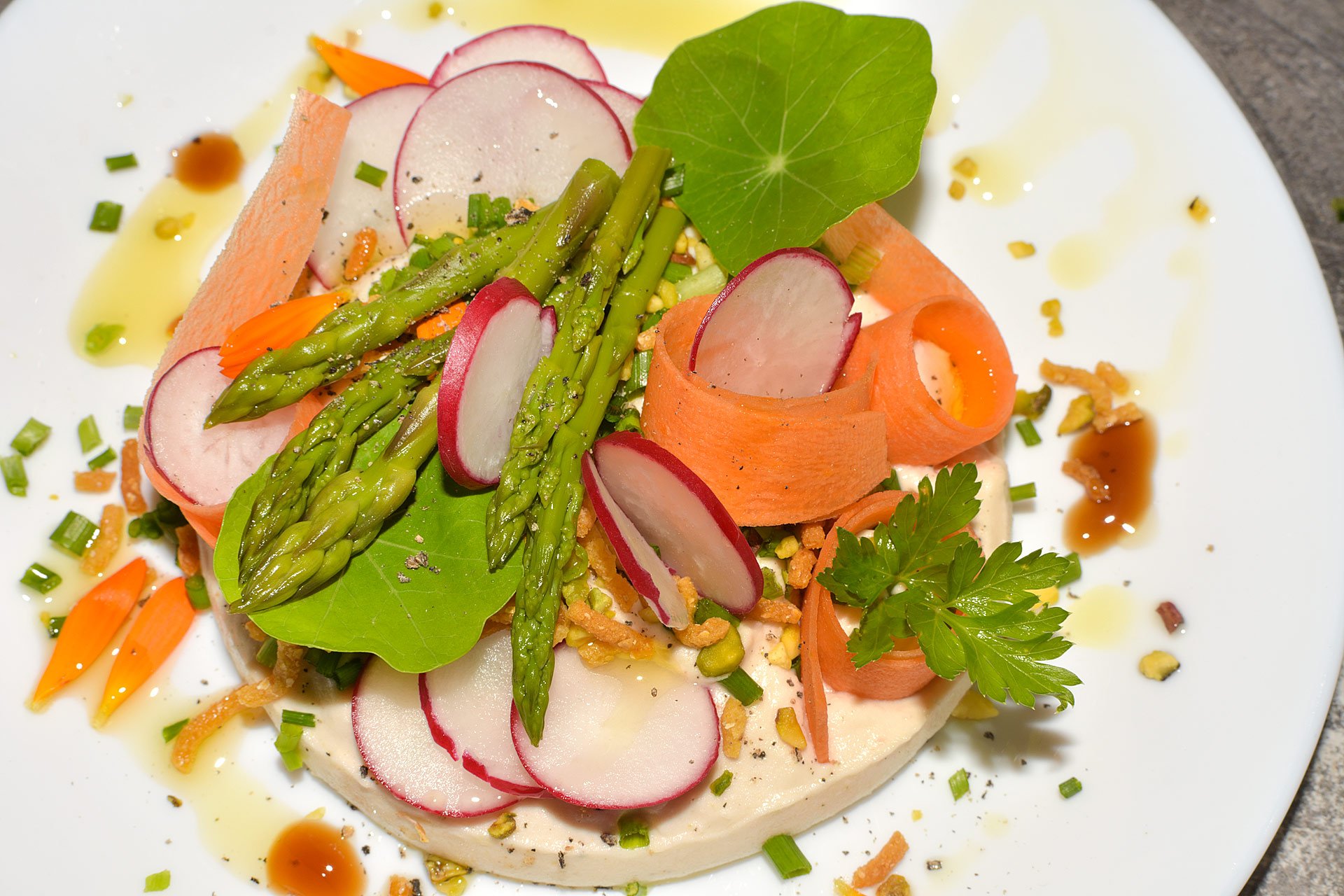 - Do středu položte chřest a obložte lístky lichořeřišnice a kvítky měsíčku.