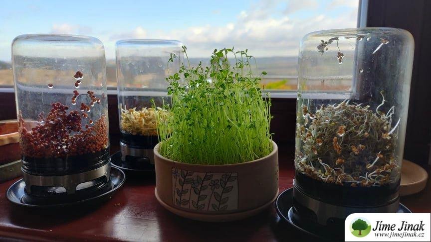 Když mi bylo na práci na zahradě ještě moc zima, realizovala jsem se v kuchyni. Klíčí to a kvasí v každém rohu. Každý kousek parapetu jsem obsadila. Tu mi klíčí semínka v klíčidle, tu na vatě roste microgreens, bublají mi tři různé kvásky (ty zimní už jsou po smrti, takže jsem založila nový, rovnou tři různé, aby se neřeklo) a když rozkrojím dýní, tak už v ní nejsou jen mírně naklíčená semínka jako posledně, jsou tam zelené lístečky! Čočka naklíčila takovým fofrem, že místo klíčků máme rostlinky. Nevadí, taky je sníme. Každý rok mě překvapuje mě ta rychlost. V zimě jsem klíčky vytahovala pomalu očima a teď to roste tak rychle, že je sotva stíháme jíst. Klíčky máme na každém talíři ke každému jídlu.
