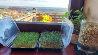 Automaticky začínám už v lednu ve velkém klíčit a pěstovat mikrogreens. S blížícím se únorem rostlinky rostly rychleji a rychleji a teď v březnu už jsou úplně splašené a lezou všemi otvory v keramické misce ven. V lednici mám pořád zásobu několika druhů a na oknech už raší další. Něco ve mě je nesmírně spokojené, že mám vlastní čerstvou zeleninu na oknech stále po ruce (a tu letní pořád ještě ve sklepě). Parapety mám obsazené krabičkami a sklenicemi s rostlinkami. Zajímavé je, že pokojové kytky u mě trpí nedostatkem péče a zálivku dostanou, až když je zjevné, že mají žízeň, ale klíčky a mikrogreens dokážu obsloužit ráno i večer bez jediného zaváhání. Pokojovky na tom nakonec taky získají, protože když už se do toho pustím, tak většinou zaliju i ty kytičky. Dokonce se mi teď podařilo jednu chuděru přelít!