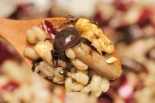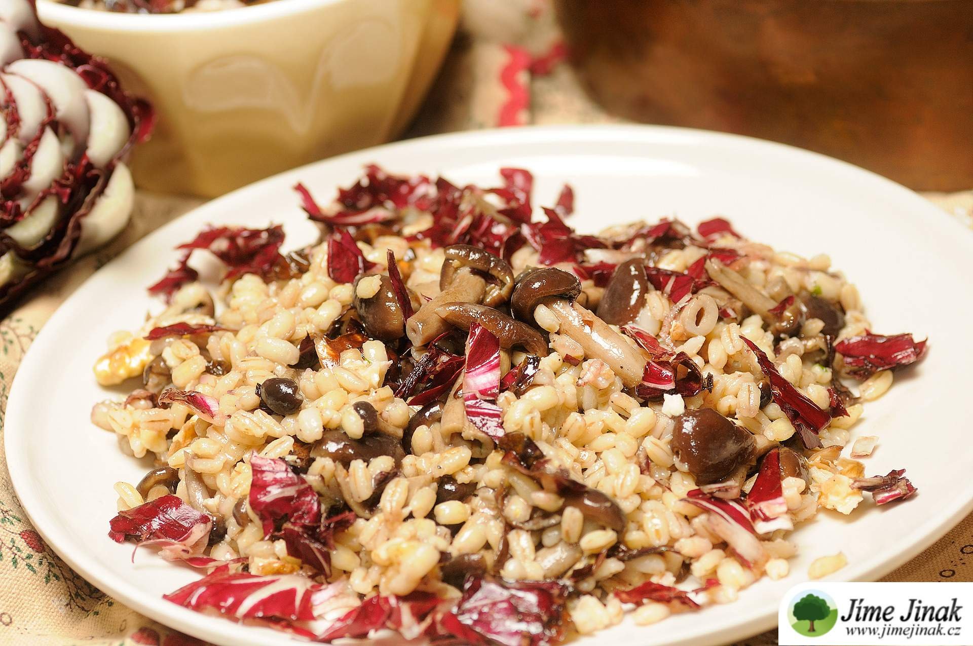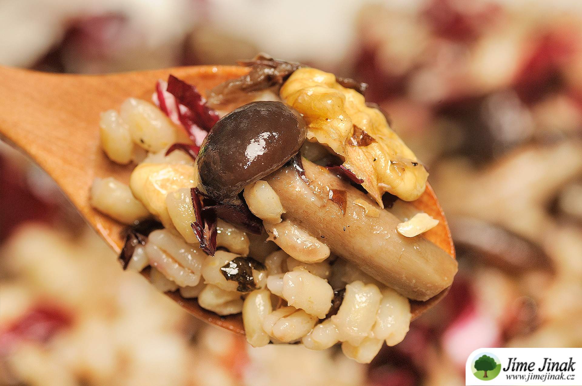 - Přidejte vařený ječmen na pánev k houbám a pořádně promíchejte. Úplně na konec přidejte červenou čekanku nakrájenou na proužky.