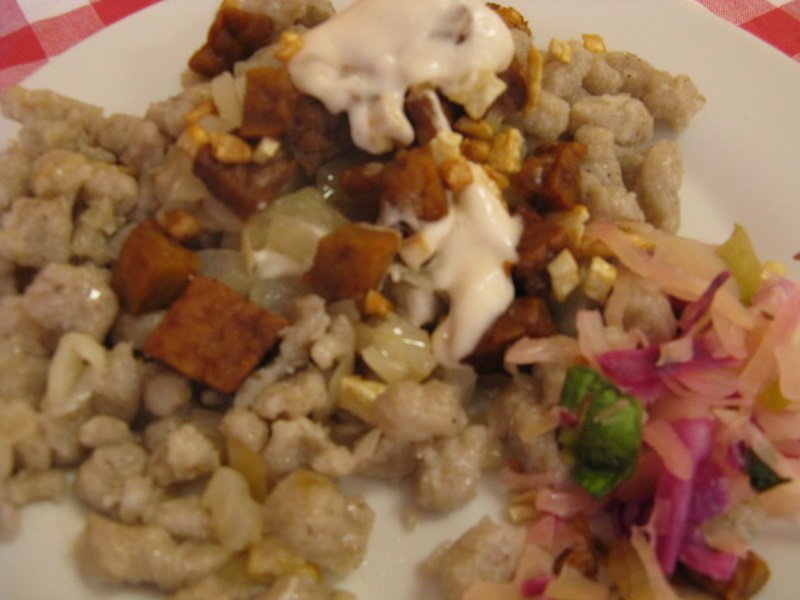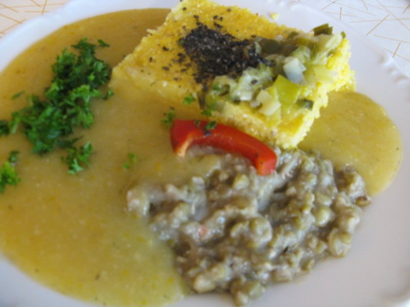 polévka mungo na tymiánu zeleninová omáčka zapečená polenta, gomasio | chlupaté knedlíky, uzené tofu, kysané zelí a vločky | citronový puding | |