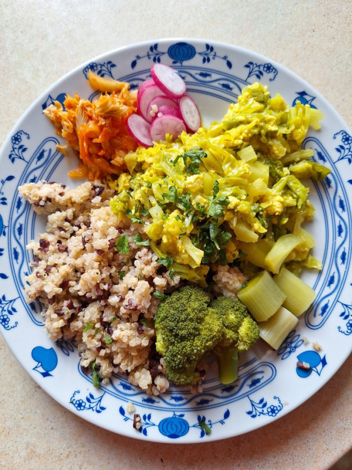 - Ke směsi nadrobíme natural tofu, přidáme kurkumu a vajíčkovou sůl a ještě chvilku osmažíme.