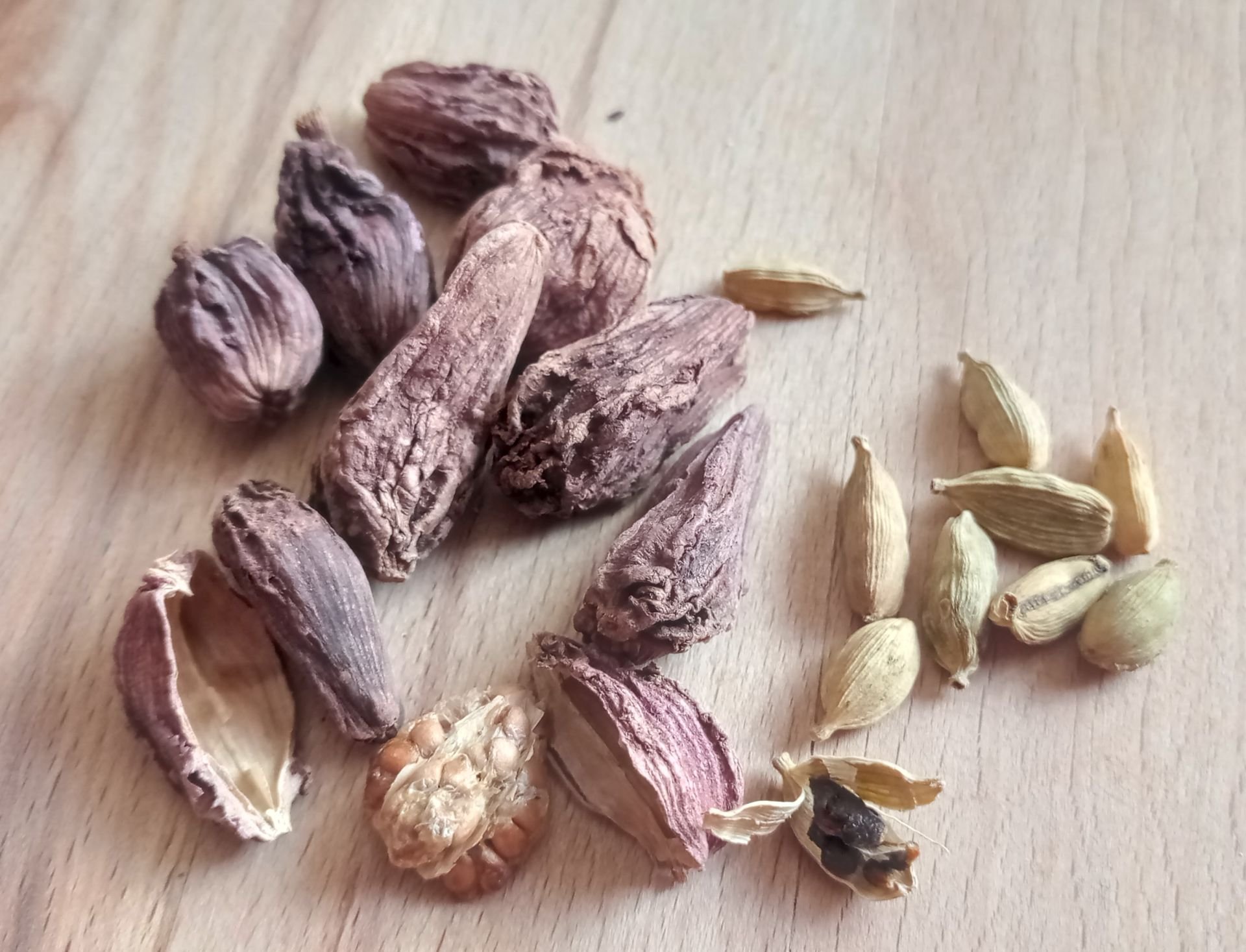 - Černý kardamom nebo také hnědý, je větší a pochází z východních Himalájí a většinou se pěstuje v Nepálu.
