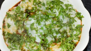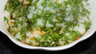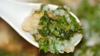 - Po uplynutí potřebné doby přimíchejte do kaše rukolu, naservírujte a pokapejte tamari.
