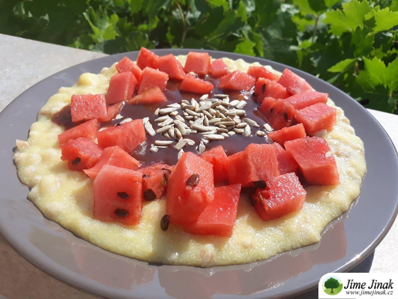 Kukuřičná kaše se špaldovým kernottem, melounem a čokoládovou polevou
