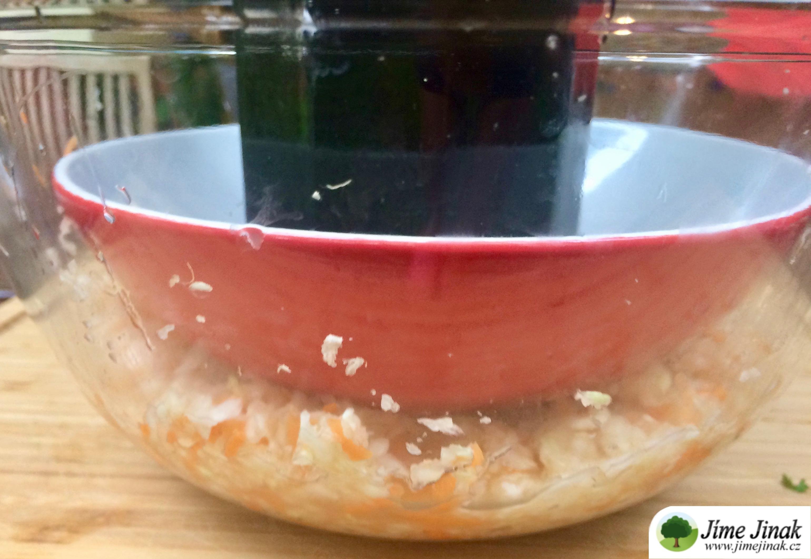 - Upěchujeme v míse, přiklopíme talířkem nebo miskou, které pasují do mísy, aby byla zelenina pod tlakem a zatížíme. Ideálně lahví vody.