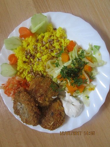 Luštěninové karbenátky s kurkumovou rýži a zeleninou.