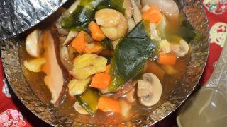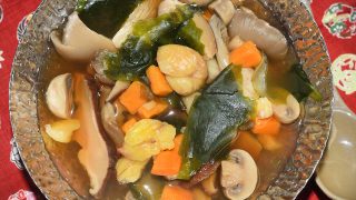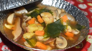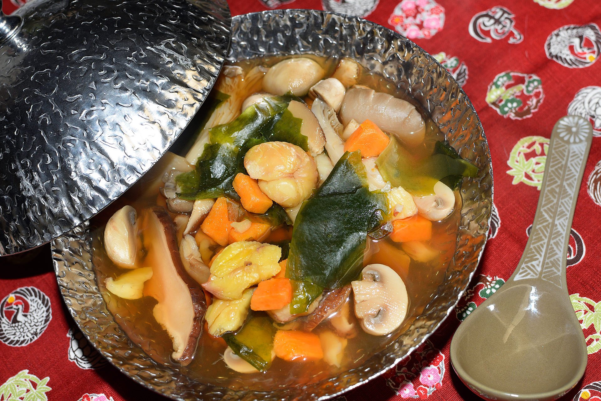 - Přidejte hlívu ústřičnou, žampiony, kaštany, mirin a tamari a vařte 15 minut. Ke konci vaření přidejte wakame a vyjměte zázvor. Vypněte oheň.