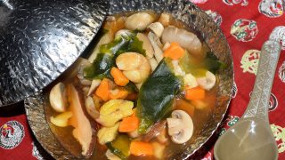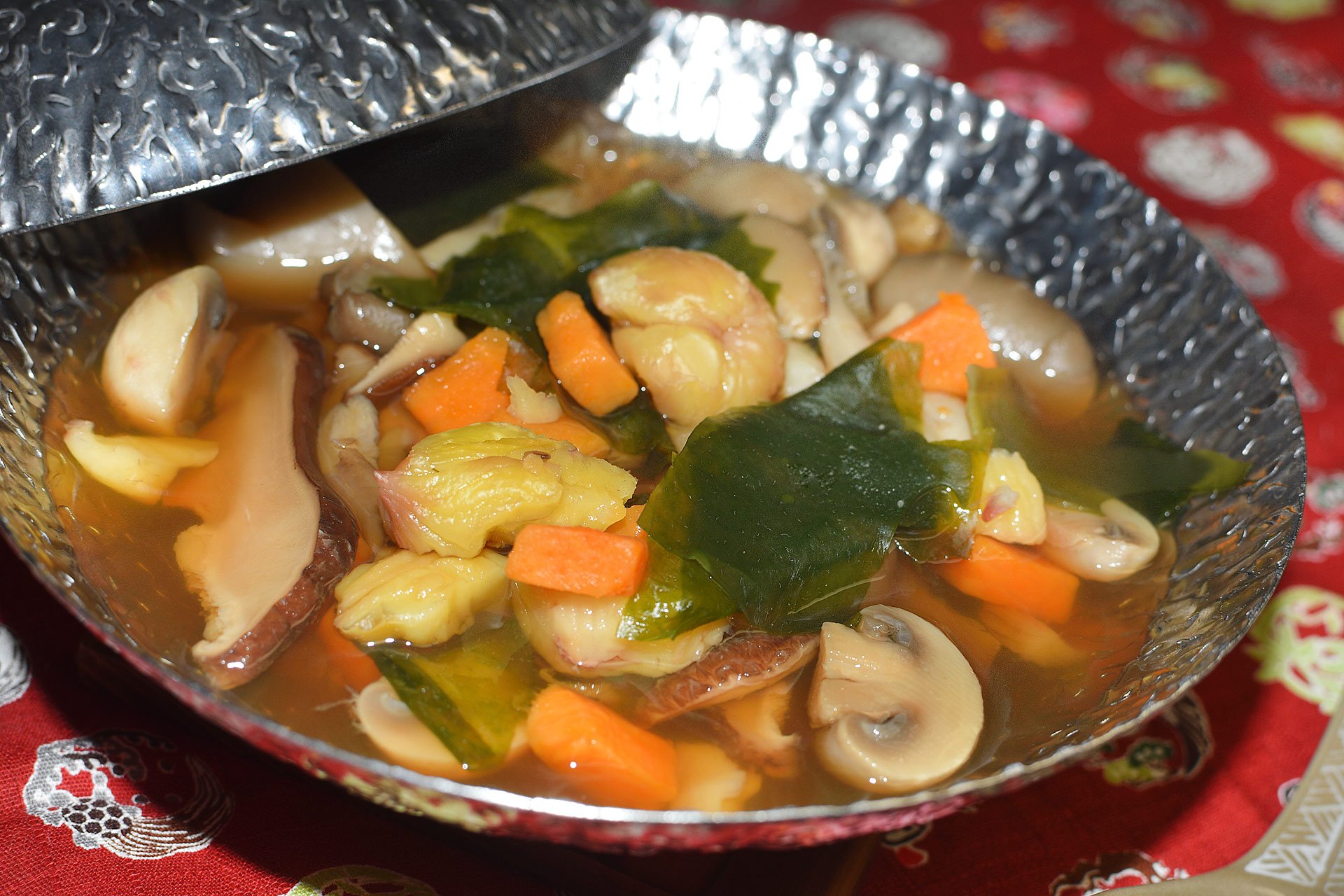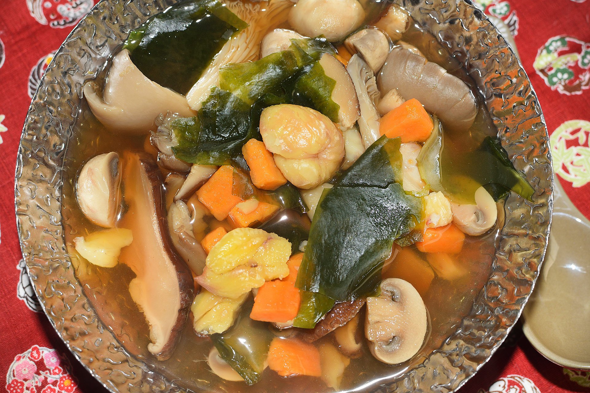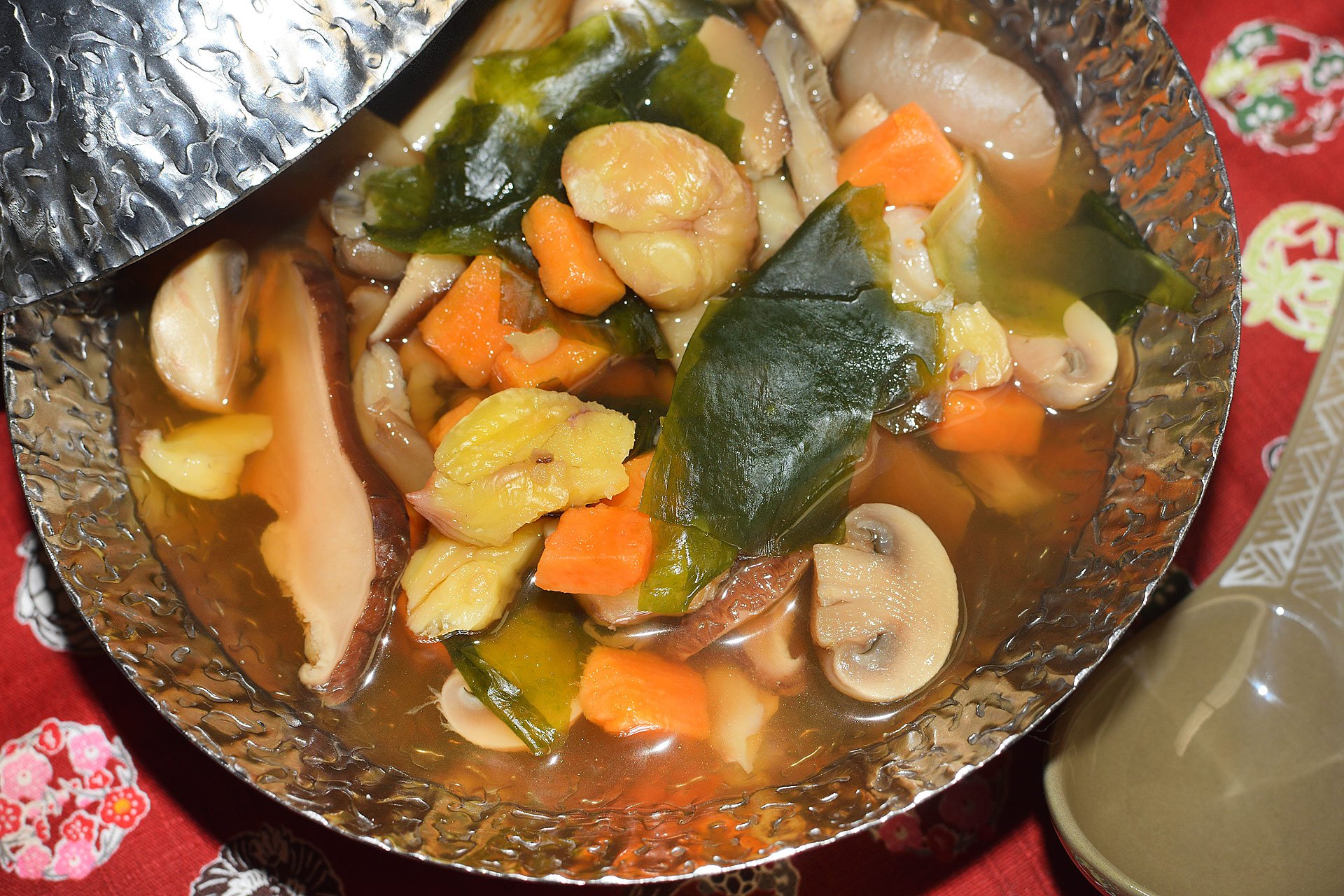 - Přidejte hlívu ústřičnou, žampiony, kaštany, mirin a tamari a vařte 15 minut. Ke konci vaření přidejte wakame a vyjměte zázvor. Vypněte oheň.