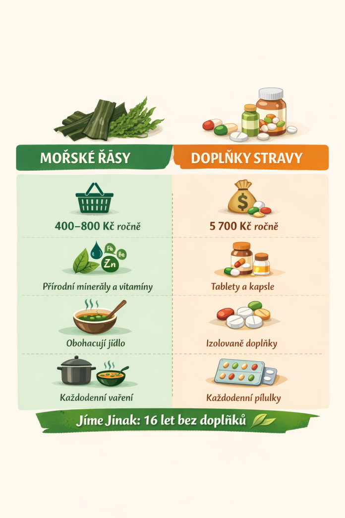 Na kurzech často slyším: „Já mám doma celou poličku vitamínů…“ My navíc máme zdravé i zuby, co jíme jinak, takže šetříme i za plomby a jiné zákroky. Já osobně například nepotřebuji injekce na ředění krve, od té doby, co jím podle Jíme Jinak. Je to celkovou skladbou jídelníčku, ale také tím, že mořské řasy jsou bohaté na antioxidanty a mají mít protizánětlivé a antikoagulační účinky.