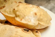 - Předehřejte pánev a na horkou pánev položte placku. Přiklopte poklicí. Asi 2-3 minuty počkejte, odklopte poklici a pokud se začaly tvořit bubliny, placku otočte. Znovu přikryjte a pečte. Po několika minutách odklopte a placka by se měla začít nafukovat. Zkontrolujte zda, je pěkně pečená z obou stran a dejte stranou.