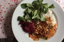 - Na fotce je rýže basmati se slunečnicovým semínkem, omáčka z mrkve a petržele a ledový salát, ale můžete si takto upravený tempeh dát s jakoukoli jinou obilovinou a zeleninou.