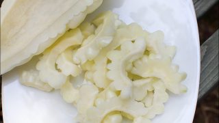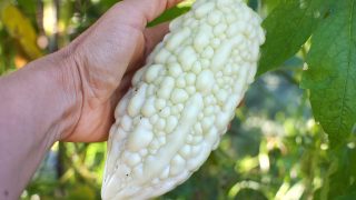 V srpnu začínám sbírat první plody, které musím hledat mezi větvemi stromů. Jejich název,純白, je dokonale vystihuje – znamená čistě bílá , a přesně taková jsou, i když fotografie to zas tak pěkně neukáže. Je to okouzlující zelenina! Existuje mnoho druhů a v Asii má každý region svou vlastní odrůdu.