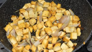 - Na jednu pánev dejte olej, tofu nakrájené na kostičky a solte. Osmahněte ze všech stran.