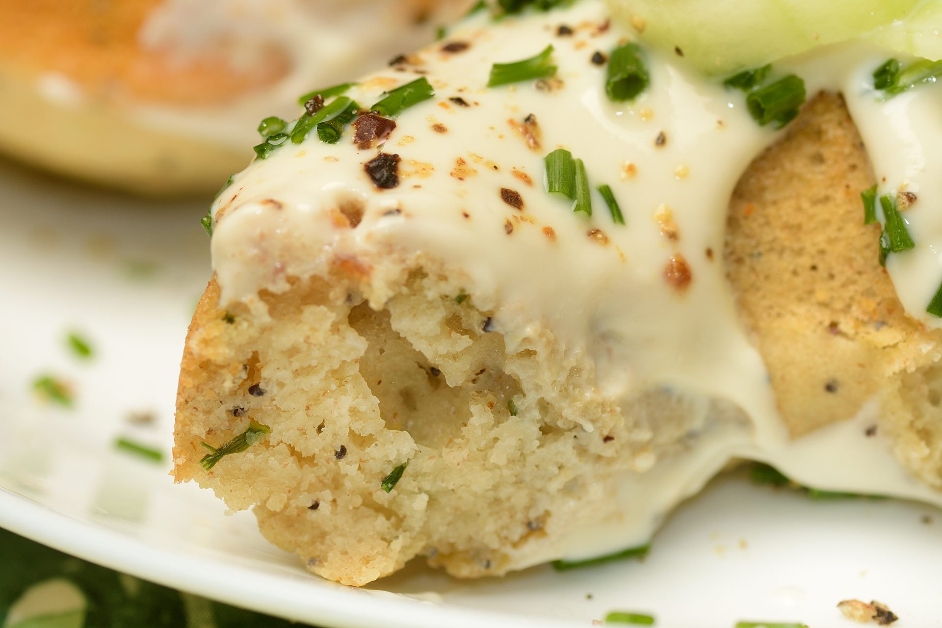 - Lžičkou dávejte polevu na donutky, opepřete povrch, posypejte pažitkou a ozdobte okurkou.