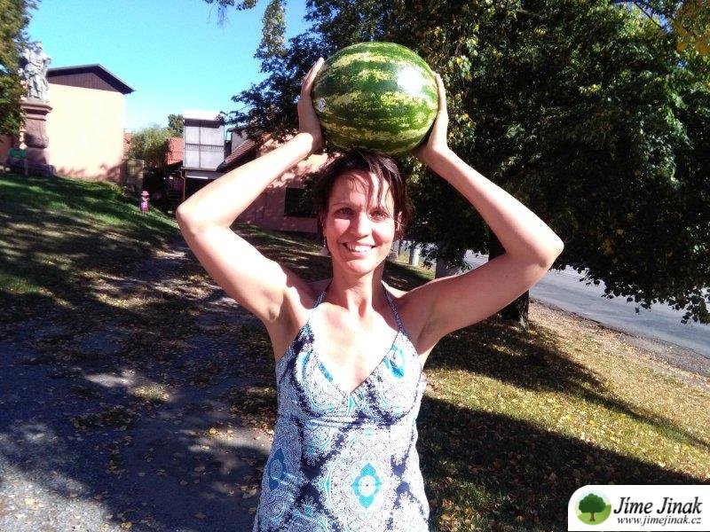 Jak čtu nové a nové zprávy od účastníků letního kurzu, že většinou právě těch 5 kilo během programu shodili, říkala jsem si s melounem v rukách, že když je to váha, kterou má člověk tahat denně někdo kolem pupku, stehen a zadku, je to teda pěkná otrava. A někteří píšou, že shodili JENOM pět kilo. Tak si říkám, že by si je měli potěžkat :-) Nesla jsem meloun k Romanovi do auta a pohrávala si s představou, že držím v ruce shozená kila našich kurzistů tak dlouho, až vzal manžel telefon a rozhodl se to zdokumentovat.
