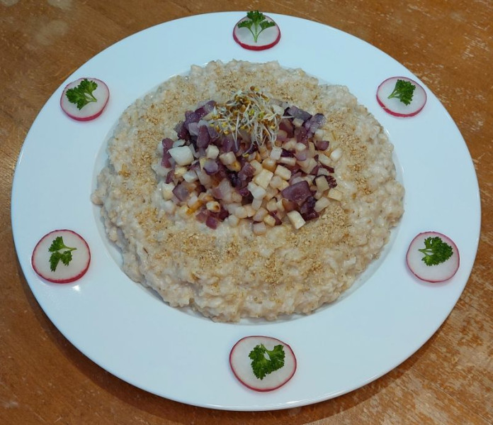 - Na ozdobu osmažíme na oleji cibulku a nakrájený (dopředu namočený a změklý) lotosový kořen.