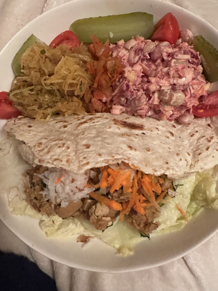 Tasovskou placku rozlomíme, jednu půlku poklademe napařeným listem kapusty, fazolovo-kuskusovou směsí, strouhanou mrkví a daikonem, pokapeme sojade a přiklopíme druhou půlkou placky. Placky teplem krásně změknou. Doplníme pickles a opraženými semínky.