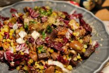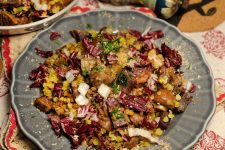 - Nakonec v jiné velké pánvi smíchejte všechno, co jste si připravili – čočku, špaldu, houby a sladký batát. Osolte, promíchejte a několik minut ještě nechte dojít. Na talíři posypejte petrželkou, červeným radicchiem a veganským parmezánem.