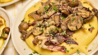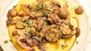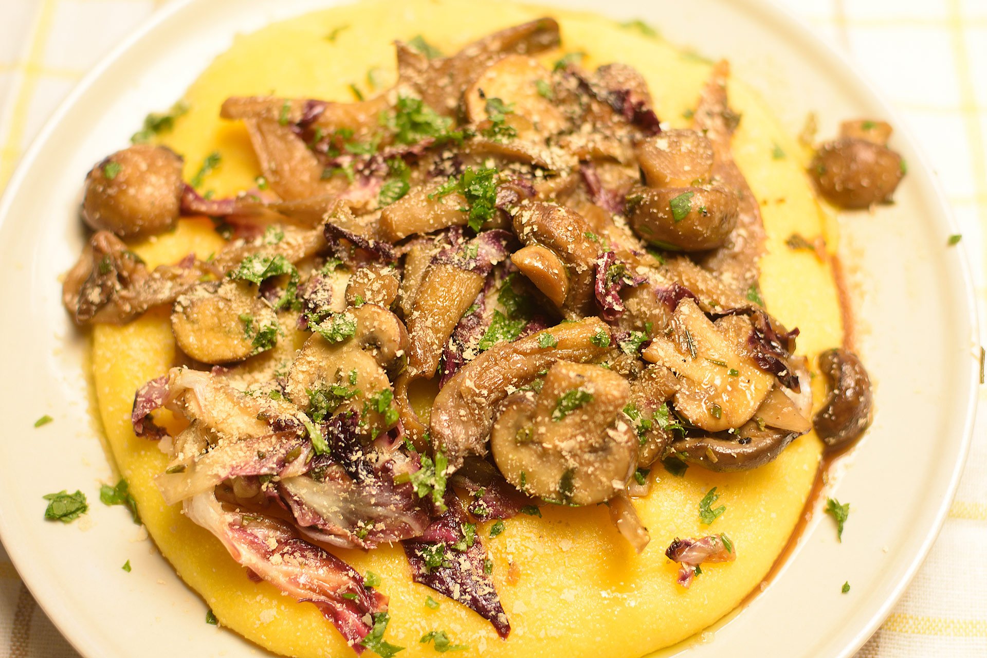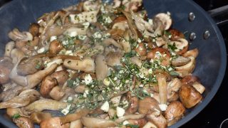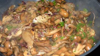 - Mezitím dejte na pánev s olejem houby a orestujte. Když jsou houby osmahnuté, přidejte nasekaný česnek s bylinkami. Promíchejte a osolte. Krátce restujte a poté přidejte nasekané radicchio.