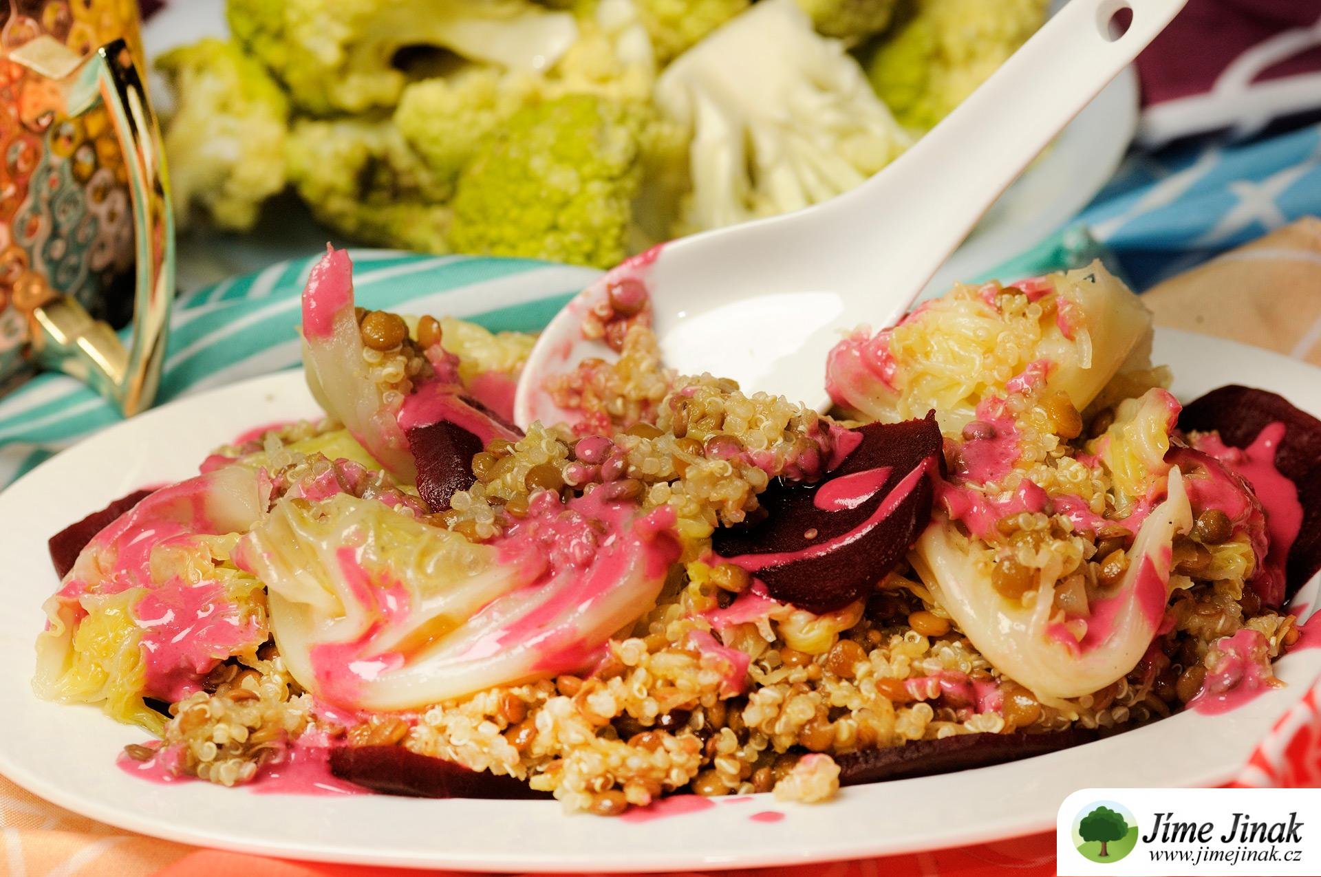 9. Na talíř servírujte plátky červené řepy, čočku s quinoou a listy kapusty ve vrstvách. Nakonec zalijte růžovým krémem.