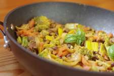 - Přidáme mrkev, pórek, brokolici, sojovou omáčku, koření a společně restujeme.