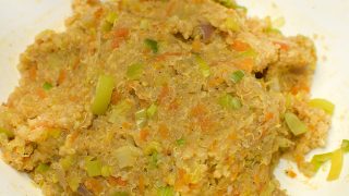 - Do mísy dejte quinou, zeleninu a lehce trošku rozmixujte tyčovým mixérem. Přidejte lahůdkové droždí, promíchejte a vytvořte v ruce ploché placičky.